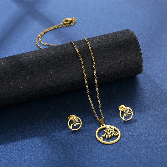 "Mama" Pendant Necklace and Earrings with Flower Set for Women