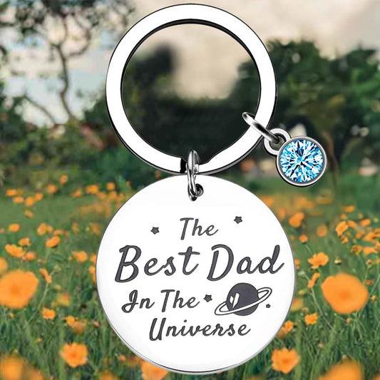 "The Best Dad In The Universe" Engraved Keychain with Blue Stone Charm