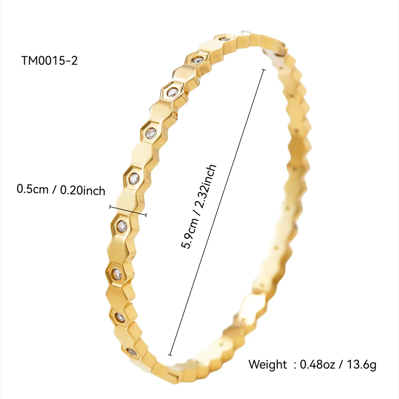 Gold Plated Stainless Steel Diamond-Encrusted Triangle Honeycomb and Heart-Shaped Bangle Bracelets for Women